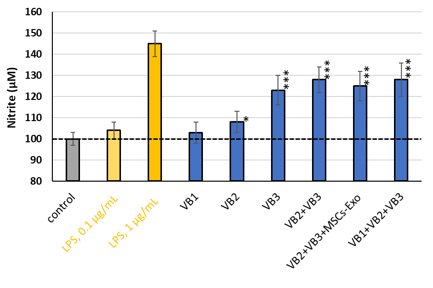 VB3がmRNAレベルでNO合成酵素を顕著に上昇させたので、マクロファージが生成するNitrite量を測定した。LPSを陽性コントロール として用いた。