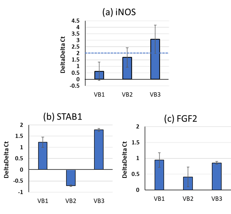 VBが表皮層を通過することが確認できたため、真皮層に存在するマクロファージ機能への影響を想定し、VBのマクロファージの活性について検討を行った。マクロファージ活性の解析には定量RT-PCRを使用し、VB1,VB2,VB3を添加したときのマクロファージにおける(a)NO合成酵素(iNOS)、(b)STAB1、(c)FGF2を測定した。