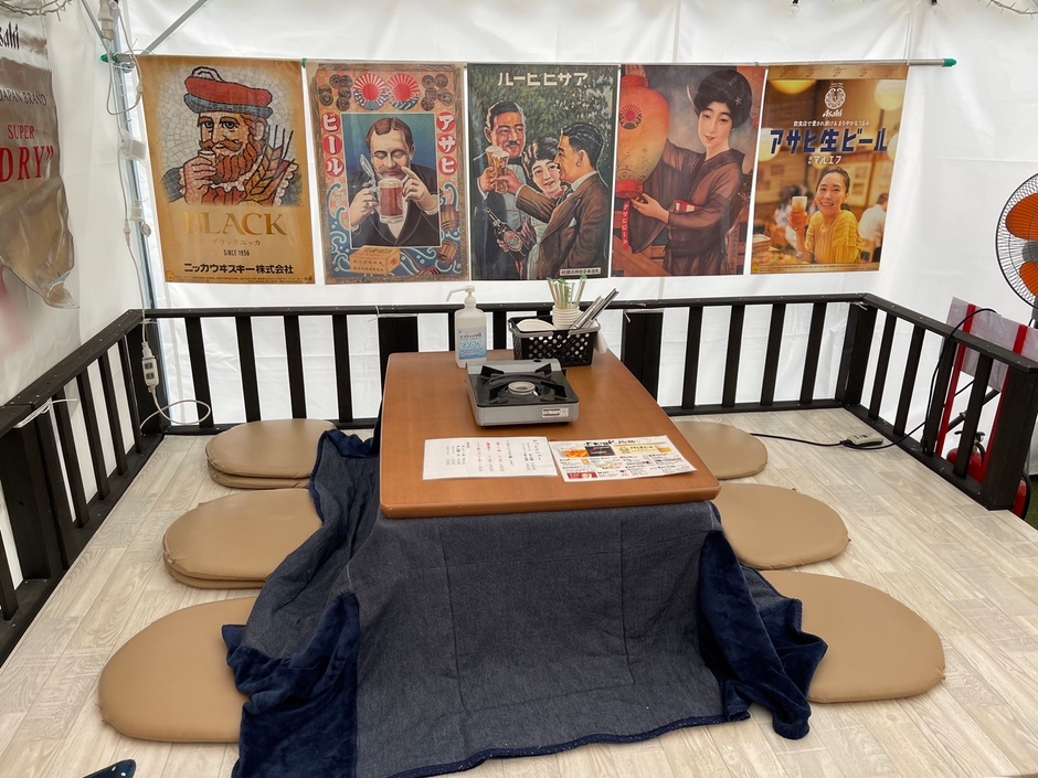 春夏営業時に敷設した芝生はそのままに小上がりコタツスペースを設置(1区画のみ)。