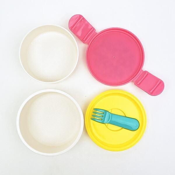 まずはこちらの抗菌丸型ランチボックス二段(フォーク付き)からご紹介。ピンクと黄色でハッピーな雰囲気です!