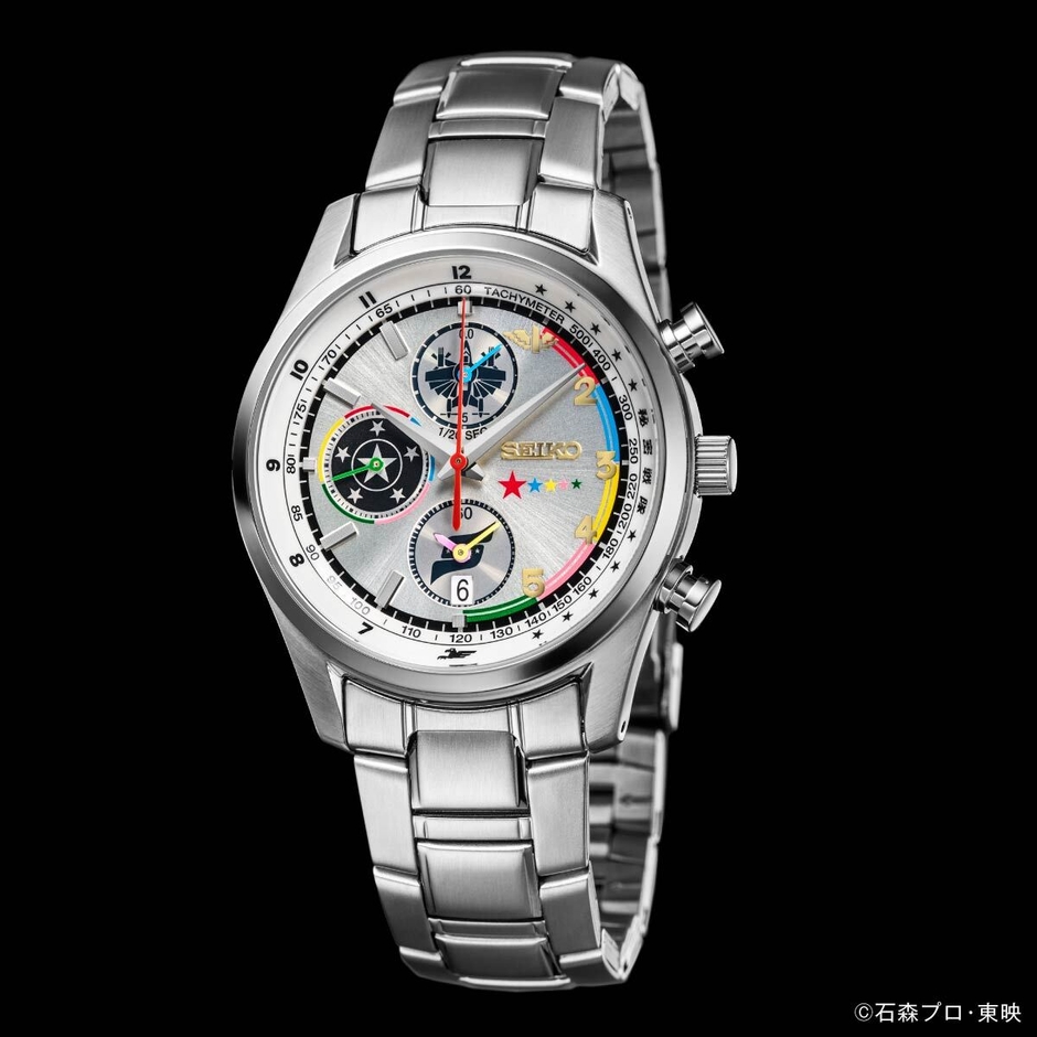 本品は1975年4月5日から放送された『秘密戦隊ゴレンジャー』の50周年を記念して特別に制作された、セイコーのクロノグラフモデルです。「ゴレンジャーマシーン」をイメージした白銀の文字盤、ゴレンジャーの額(ひたい)の数字が金色に輝く様をイメージしたインデックスとともに、巧みに散りばめられた5色のカラーリングが名セリフ、「5人揃って、ゴレンジャー!」を想起させます。
