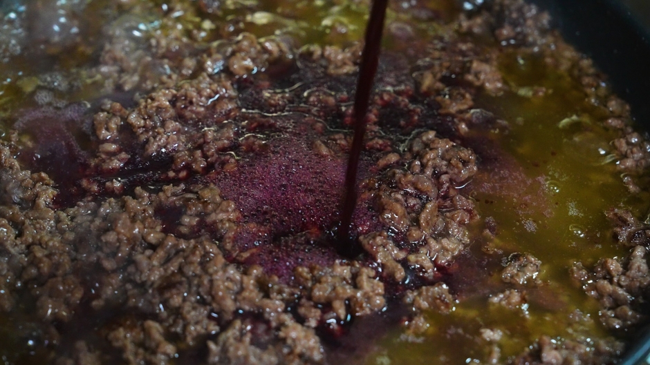 ソフリット(玉ねぎ、にんじん、セロリ、大豆油)、赤ワイン、