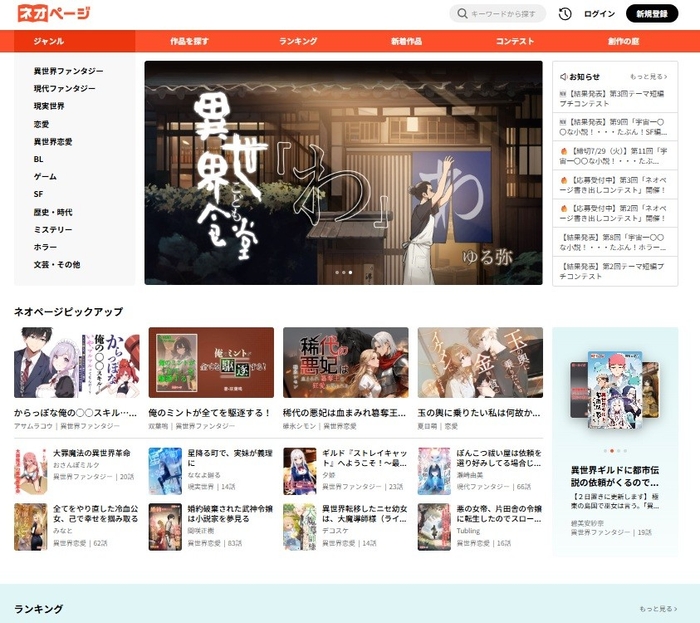 ネオページは2024年7月に正式オープンしたWeb小説投稿サイトです。多様なジャンル・作家が集まり、ユーザー参加型のランキングシステムや直感的に検索できるUI設計により、“今読みたい物語”にすぐ出会える環境を提供しています。