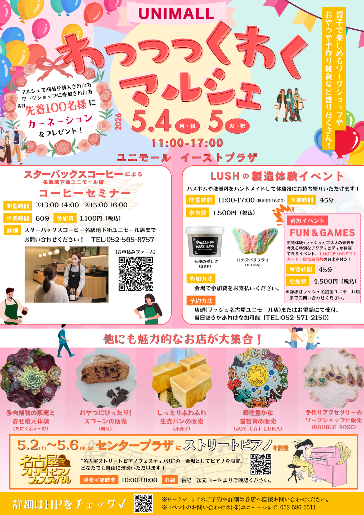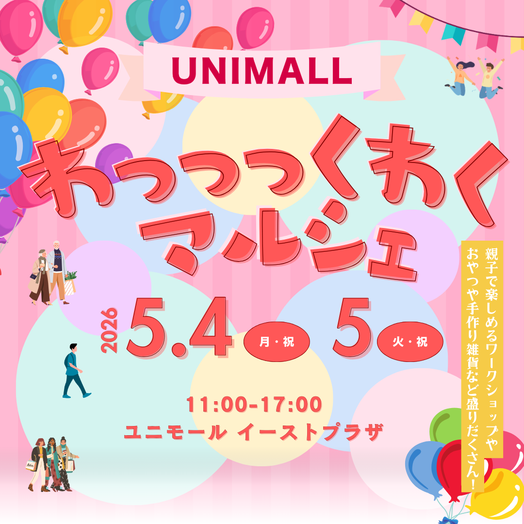 地下街及び地下駐車場の運営を行う株式会社ユニモール(所在地:愛知県名古屋市中村区、代表取締役社長:古橋 明)は、「わっっっくわくマルシェ」を2026年5月4日(月・祝)、5日(火・祝)に、名古屋市中村区の地下街「ユニモール」で行います。