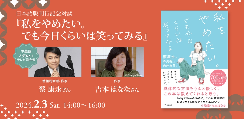 台湾を中心に、中華圏でマルチに活躍している蔡康永(ツァイ・カンヨン)さんの、“自分らしく生きる”ためのすべを教えてくれる人生エッセイ『私をやめたい。でも今日くらいは笑ってみる』刊行を記念し開催する、日本版まえがきを執筆された作家・吉本ばななさんとの豪華対談です。
