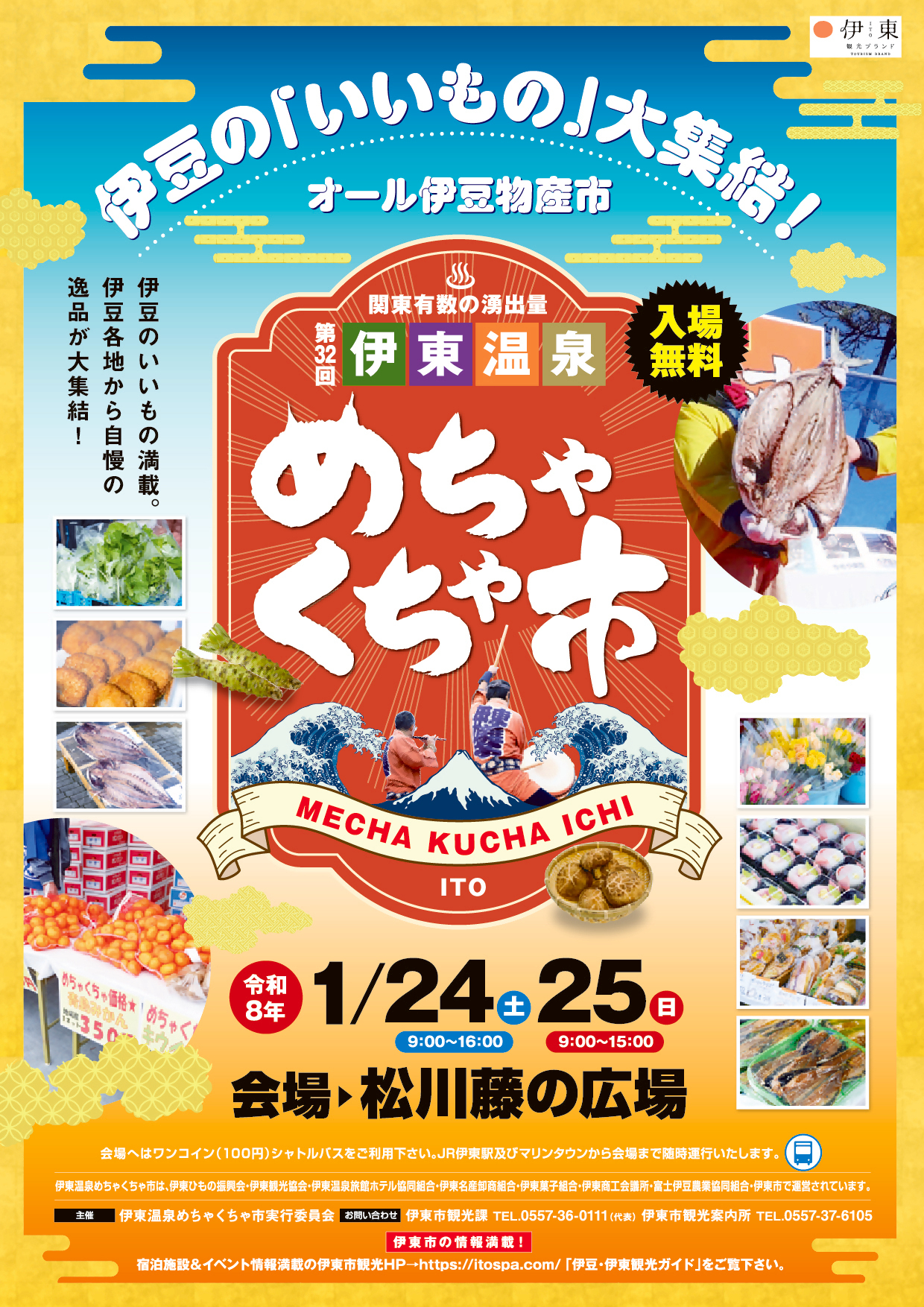 伊東市(庁舎:静岡県伊東市、市長:杉本 憲也)は、令和8年1月24日(土)、25日(日)に松川藤の広場(静岡県伊東市渚町1)で「第32回伊東温泉めちゃくちゃ市」を開催します。