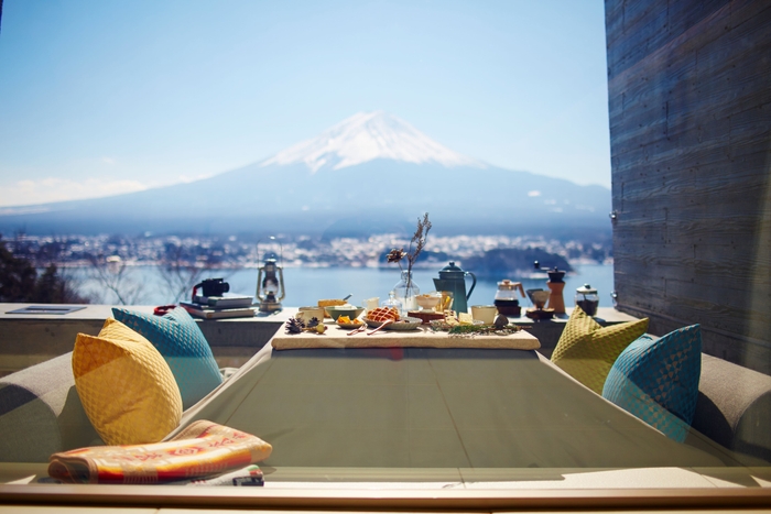 キャビンのテラスリビングにはこたつが設置されます。キャビンからは富士山と河口湖を望み、大自然を身近に感じることができます。また、こたつでルームサービスの食事や、お酒を楽しむなど過ごし方も様々です。夜はファイヤープレイスの明かりを眺めながら、テラスリビングで快適に過ごすことができます。