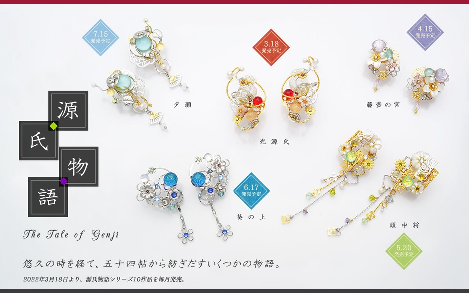 時代を超えて読み継がれてきた源氏物語全54帖の中から、主人公である光源氏を取り巻く9人の登場人物にスポットをあて、それぞれがもつストーリーや人物像をもとにデザインした「源氏物語シリーズ」のぴあり(イヤリング)全10点を、3月18日から毎月第3金曜日に1点ずつ順次発売していきます。