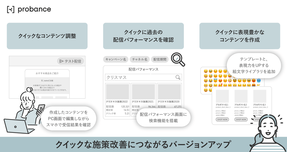 マーケティング活動で成果を出すためには、各顧客に最適化されたコミュニケーションをタイムリーに設計する必要があります。このたびの「Probance」のバージョンアップでは、マーケターが施策を円滑に実行できるように、以下3つのポイントが改良されました。