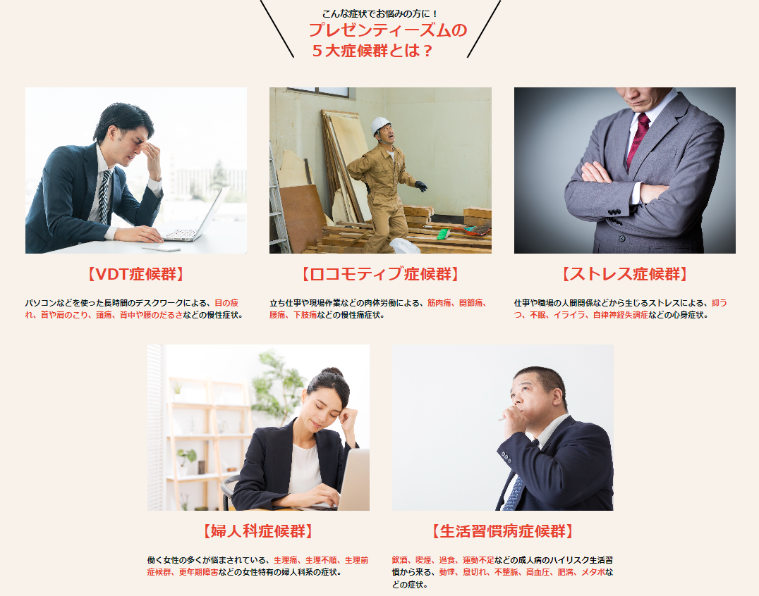 プレゼンティーズムの予防・改善については、多くの健康経営優良法人が取り組んでいる共通課題であり、特に、業種や規模に関係なく、多くの社員が悩んでいる「肩こり」「頭痛」「腰痛」「生理痛」「うつ」「不眠」「更年期障害」などについては、効果的な対策が講じられていないケースも多い。