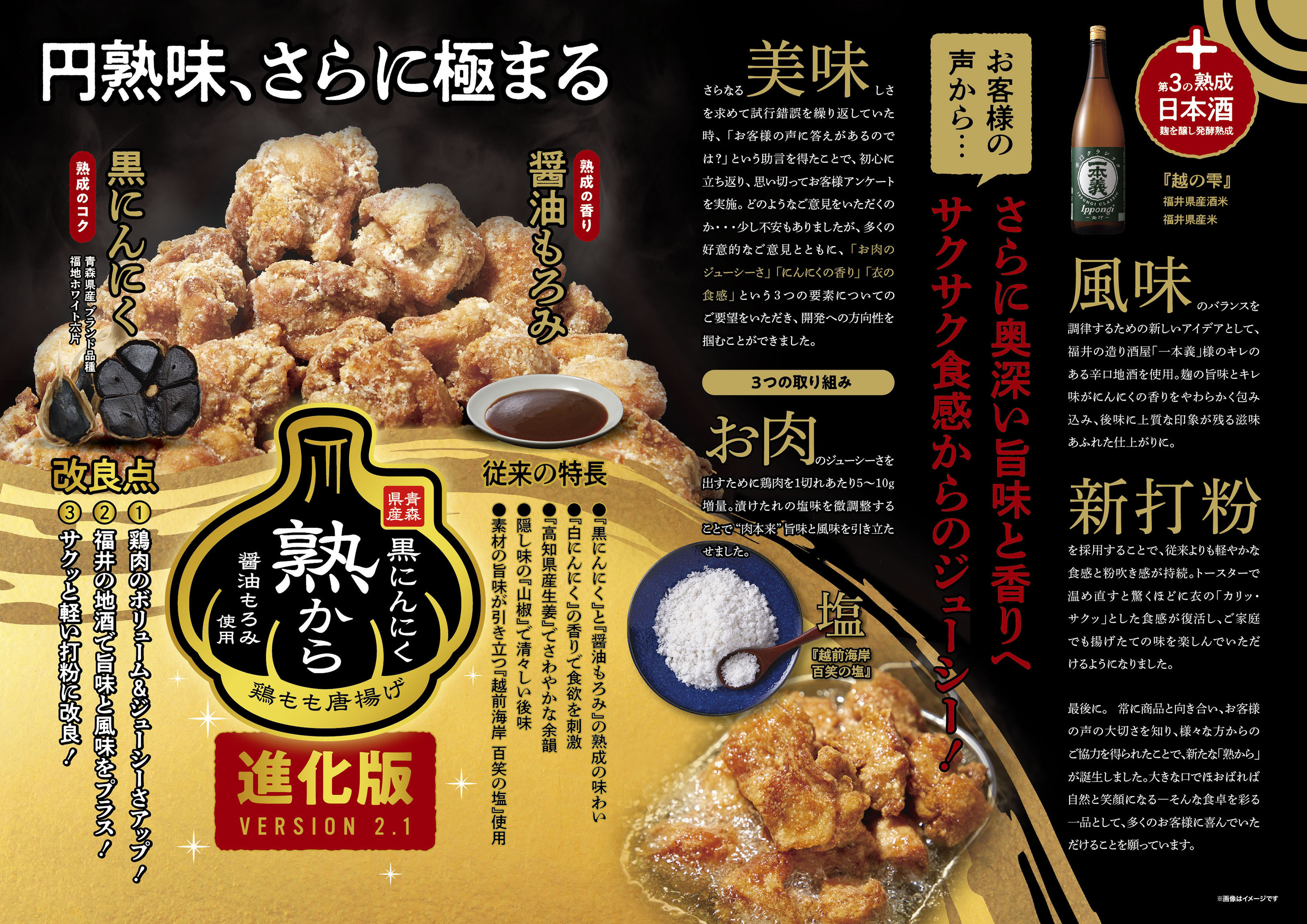 さらに今回、新たに福井の造り酒屋「一本義」様の辛口地酒を使用し、麹を醸し、発酵・熟成させた日本酒由来の旨味によって、にんにくの香りにキレと奥行きを加えました。