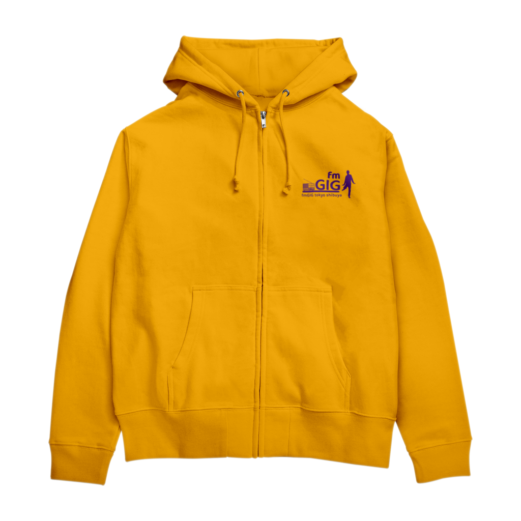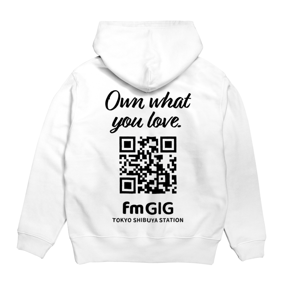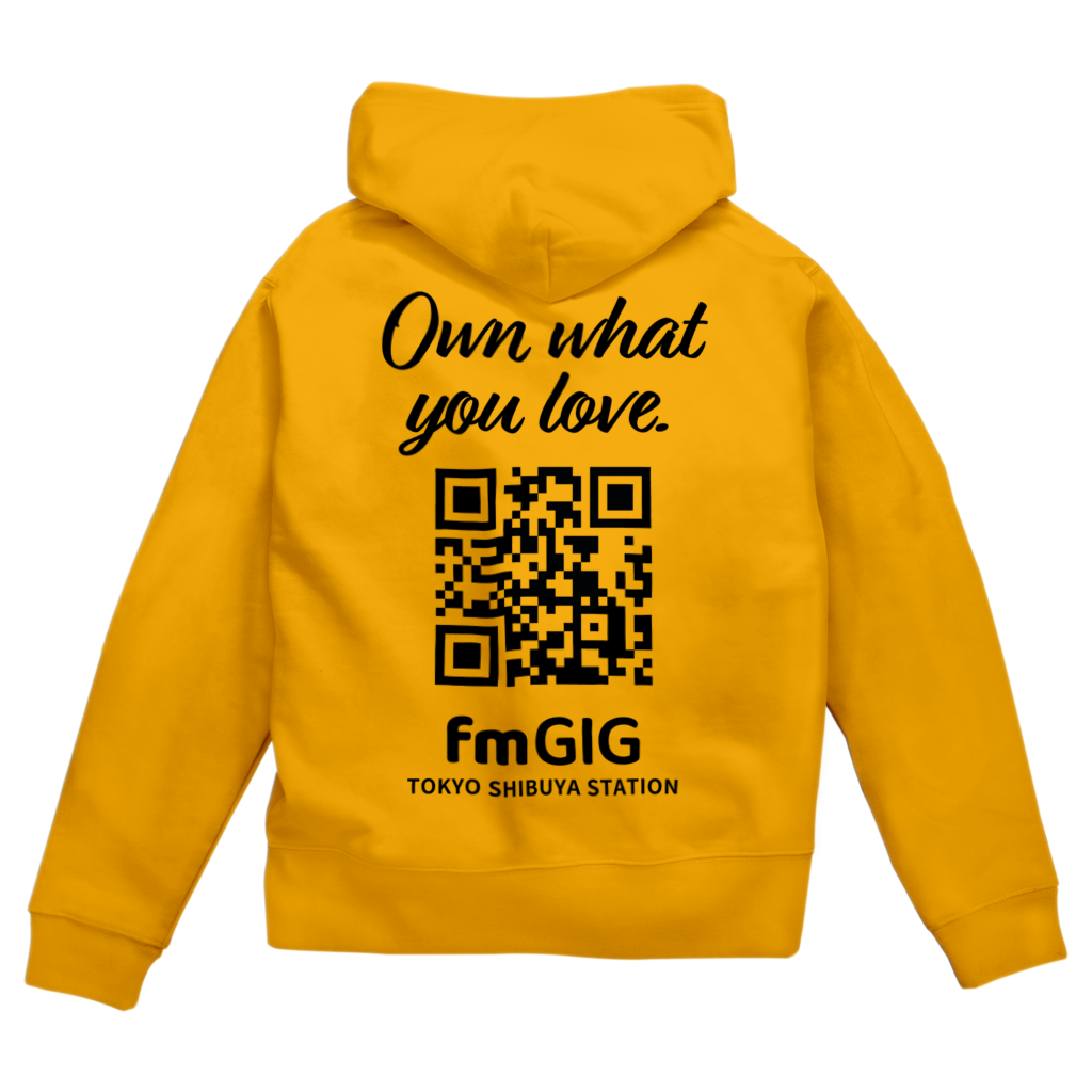 デザインパターンはしっかりロゴデザインされている白色のパーカーと、胸元にロゴデザインされているfmGIG TOKYO渋谷ステーションイメージカラーであるゴールド色のジップパーカー。さらにfmGIG TOKYO渋谷ステーションのコンセプト「あなたの【好き】を全肯定」のメッセージをストリート風に表現した裏面デザインの有無を選択できる4種類での販売となります。