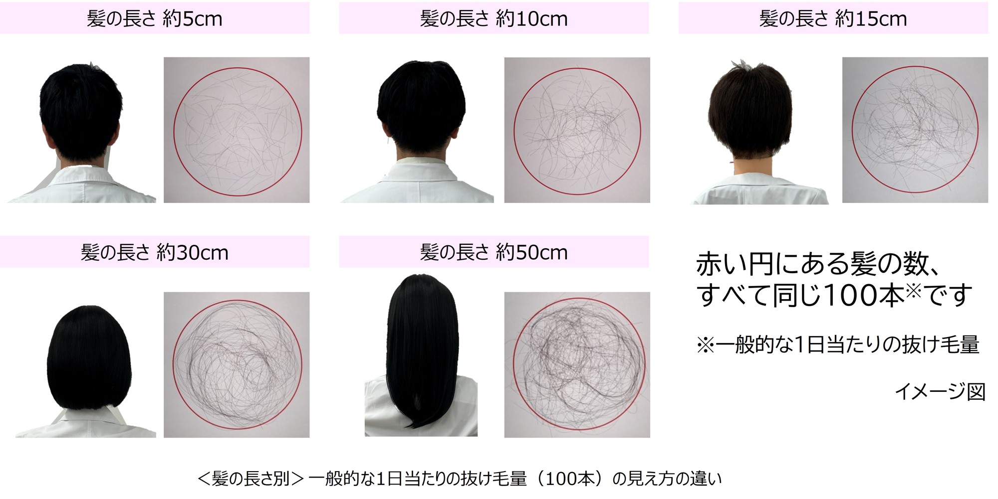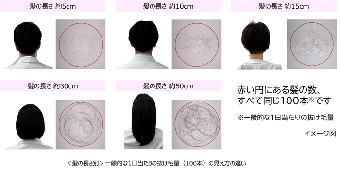 そこで、自分の抜け毛量をイメージしやすいように、髪の長さ別に1日の抜け毛量を可視化しました。その結果、同じ抜け毛本数であっても、髪の長さによって印象が大きく異なりました。