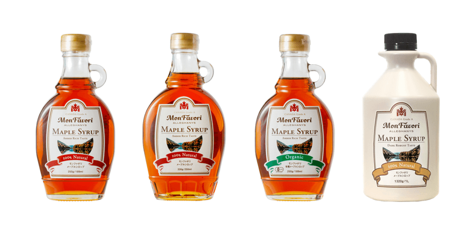 カナダ産のメープルシロップは樹液の採取時期によって色や風味が異なり、その濃淡によって4つのグレードに分類されます。モンファボリは美しい琥珀色とほどよい風味が特徴の「アンバー(リッチテイスト)」というグレードに属しています。毎日お使いいただいても飽きの来ない、やさしい味わいです。