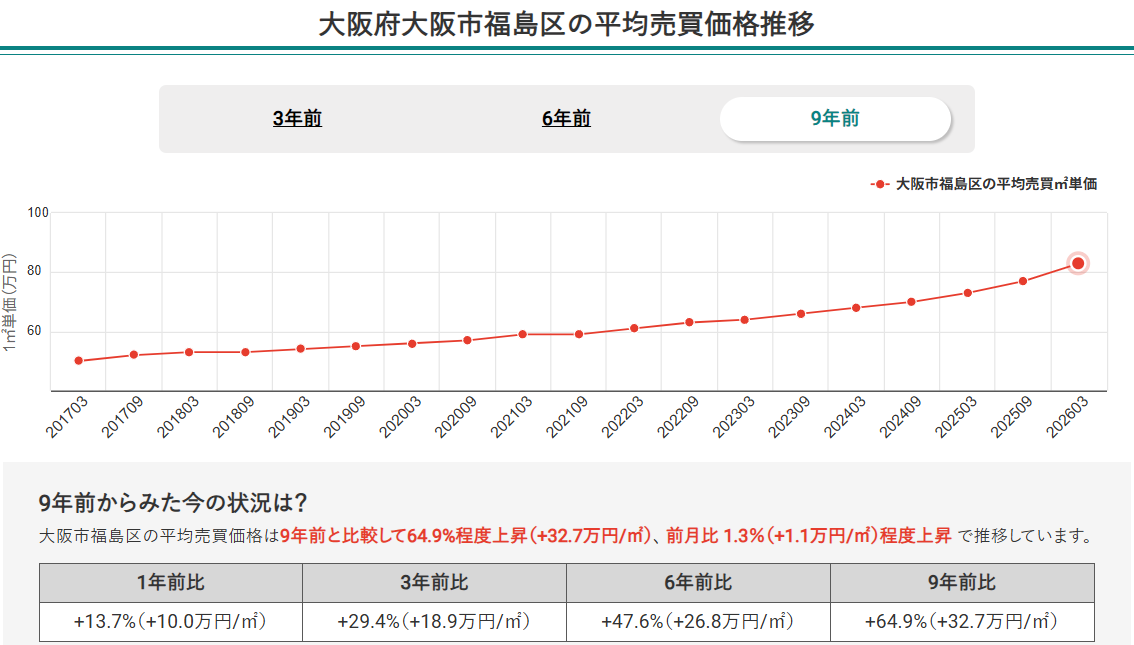 2.2026年3月時点で、大阪府全体の中古マンション平均平米単価は9年間で77.2%上昇。長期的な右肩上がりの成長トレンドを維持