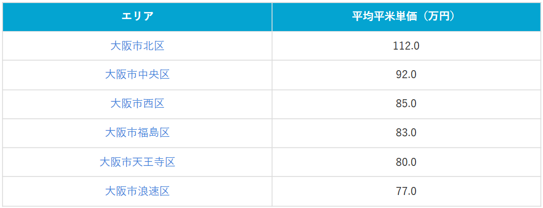 2026年4月現在の大阪市24区全体の平均平米単価は57.38万円と、府平均と同等の水準です。しかし、市内の内訳を見ると区ごとの価格差は年々顕著になっています。 特に、北区・中央区・西区・天王寺区・浪速区・福島区からなる「都心6区」は非常に高い平米単価を誇ります。これらの区は、優れた交通ネットワークや再開発の恩恵を直接享受できるため、資産価値の下落リスクが低い安定した市場となっています。