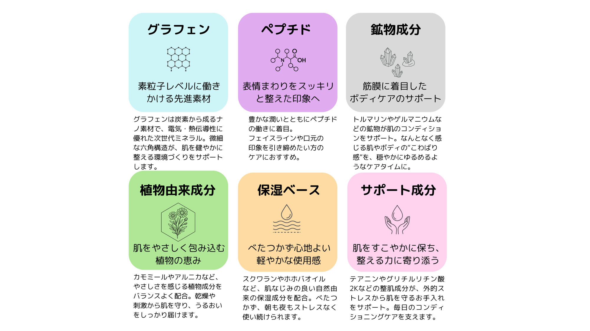 炭素から生まれた先端素材「グラフェン」と、白金・ゲルマニウムなどのミネラルを組み合わせた処方が、肌のコンディションをすこやかに整え、心地よいケア時間をサポートします。