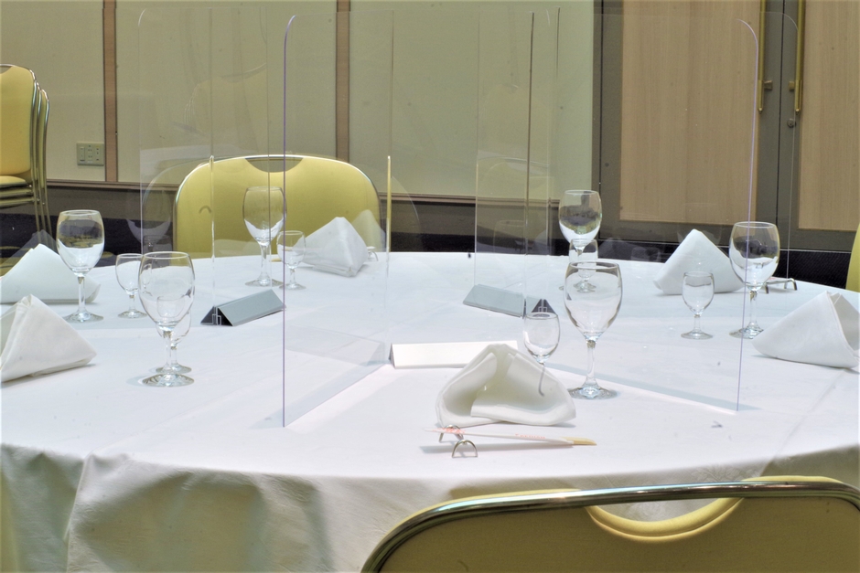 このプランは、新型コロナウイルス感染症対策として従来からおこなってまいりました、館内の換気、ソーシャルディスタンスの確保、消毒液の設置、飛沫防止パネル設置などに加え、配膳回数を減らしたメニューを考案し、より安全にお食事を楽しんでいただけるようにいたしました。また、エチケットマスク(シールド)を別途ご用意。飛沫防止用のシールドを片手にお食事中の会話をお愉しみいただくことが可能です。従来通りとはいかない時代でも、新たな安全性と快適なひととき、ホテルならではの上質なご宴席をご用意しております。