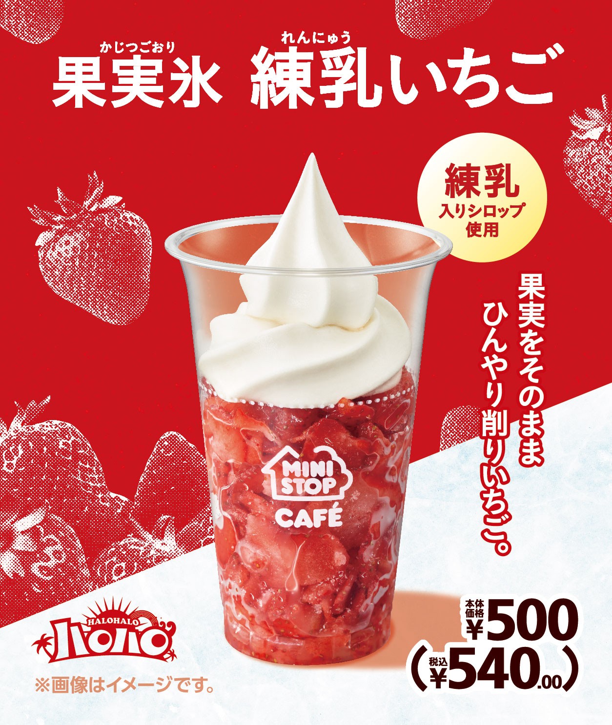 「ハロハロ 果実氷練乳いちご」は、好評販売中の「北海道ミルクソフト」と酸味のあるフローズンいちご、さらに練乳入りシロップを組み合わせた、ミニストップならではのスイーツです。