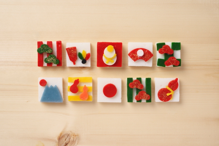 今回は、お正月のモチーフが全10種類登場(※約3.5cm四方角のひと口サイズ)。しかも、今回は特別バージョンのキラキラ金粉入り。おせちやお雑煮に添えるだけで、お料理の表情がぐっと豊かに。そして、くすっと笑顔がこぼれます。