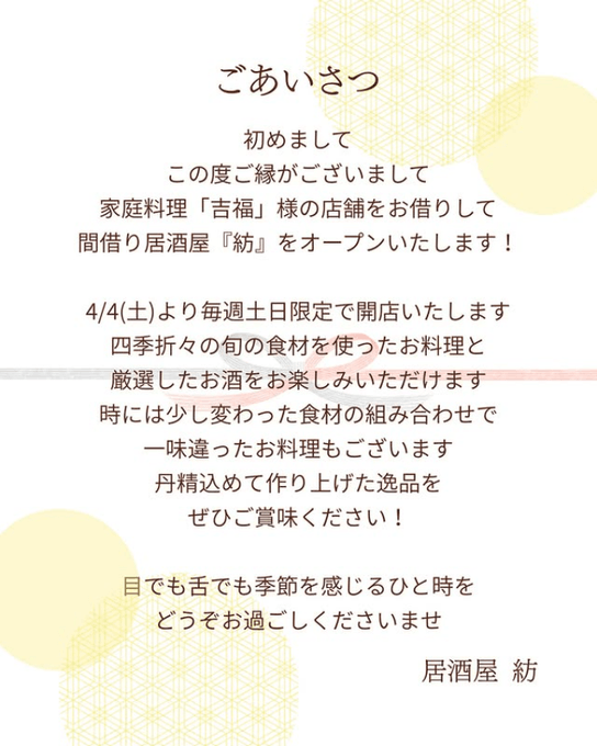 2026年4月に、五反田に土日限定で営業する居酒屋「紡(つむぎ)」がオープンいたします。