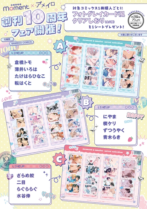 moment×アメイロ「創刊10周年記念フェア」開催!! 対象コミックス1冊購入ごとに 『フォトグレイカード風クリアしおり』 (全3種)を1シートプレゼント!