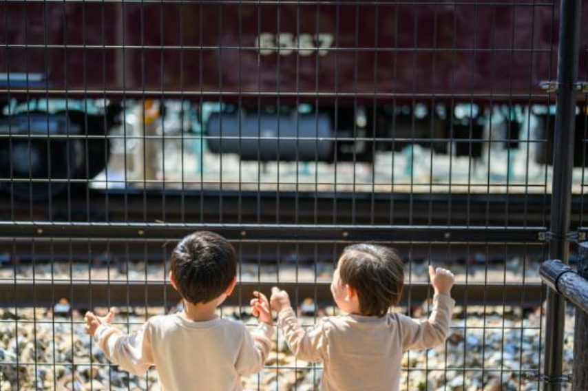 花見に来たはずが子供たちは電車に夢中。特等席で甲陽線のゆったりした電車を2人仲良く眺めていました。