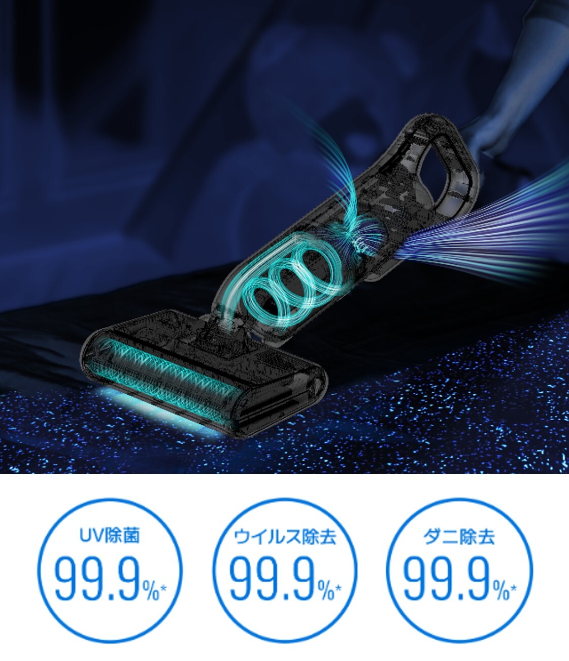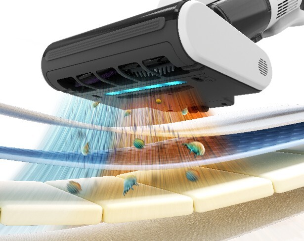 また、115,000回/分の高速回転たたきブラシと、高品質・高耐性なBLDCモーターによる14,000 Paの強力な吸引力で、布団の奥からダニのフンや死骸を含むハウスダストをたたき出す、高効率かつパワフルな性能を実現。
