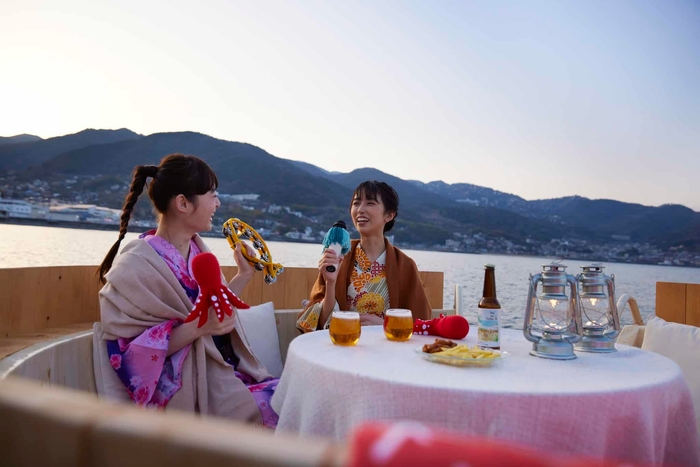 カラオケの定番アイテムは、海をモチーフにデザインされたものを取り揃えます。例えば、魚型のタンバリンやタコをモチーフにしたマラカス、綱や貝殻の装飾が施されたマイクです。また、本アクティビティ参加者には衣装として浴衣を用意します。浴衣を着て、魚型のタンバリンなどのアイテムを使うことで、より海上カラ桶への気分が高まります。