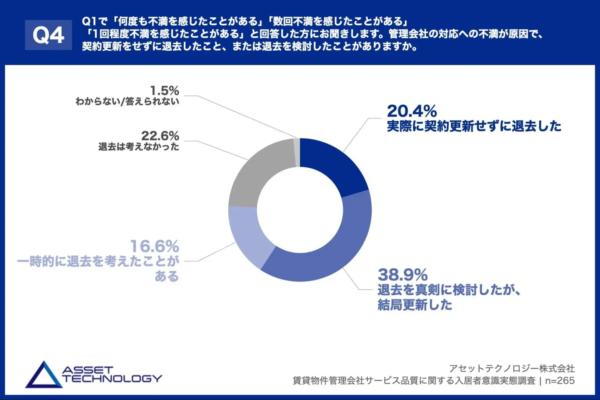 「Q4. Q1で「何度も不満を感じたことがある」「数回不満を感じたことがある」「1回程度不満を感じたことがある」と回答した方にお聞きします。管理会社の対応への不満が原因で、契約更新をせずに退去したこと、または退去を検討したことがありますか。」(n=265)と質問したところ、「実際に契約更新せずに退去した」が20.4%、「退去を真剣に検討したが、結局更新した」が38.9%という回答となりました。
