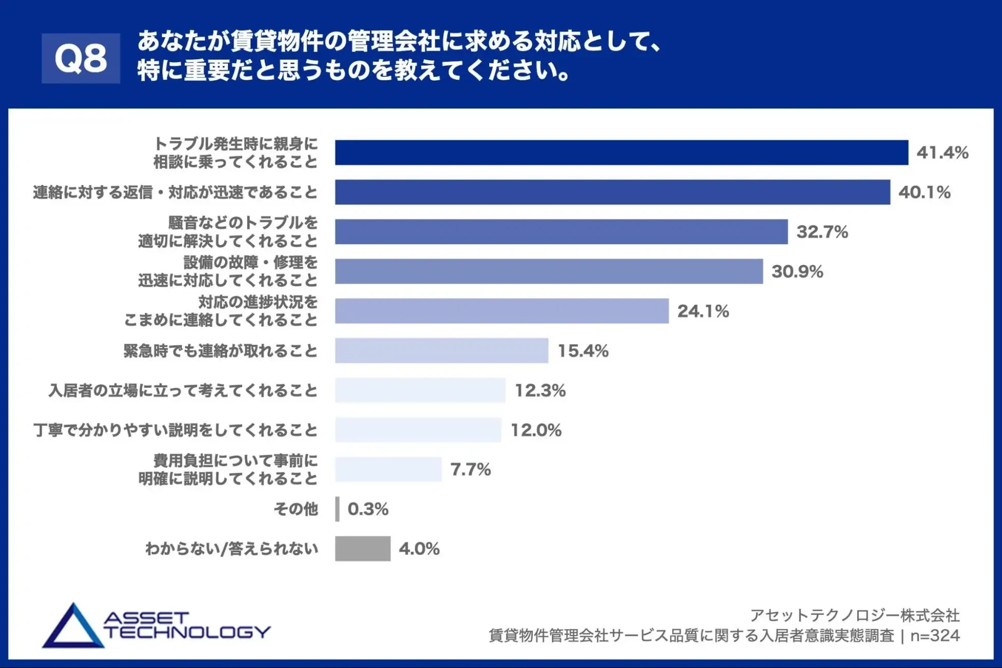 「Q8. あなたが賃貸物件の管理会社に求める対応として、特に重要だと思うものを教えてください。(上位3つまで回答可)」(n=324)と質問したところ、「トラブル発生時に親身に相談に乗ってくれること」が41.4%、「連絡に対する返信・対応が迅速であること」が40.1%、「騒音などのトラブルを適切に解決してくれること」が32.7%という回答となりました。