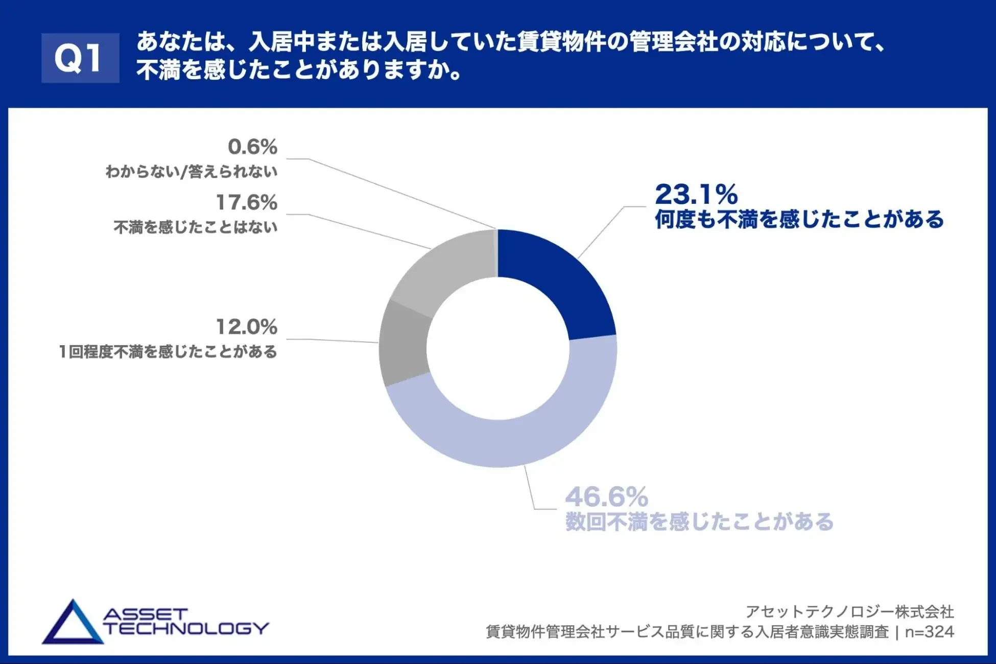 「Q1. あなたは、入居中または入居していた賃貸物件の管理会社の対応について、不満を感じたことがありますか。」(n=324)と質問したところ、「何度も不満を感じたことがある」が23.1%、「数回不満を感じたことがある」が46.6%という回答となりました。