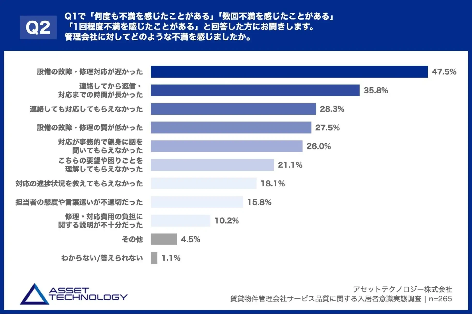 「Q2. Q1で「何度も不満を感じたことがある」「数回不満を感じたことがある」「1回程度不満を感じたことがある」と回答した方にお聞きします。管理会社に対してどのような不満を感じましたか。(複数回答)」(n=265)と質問したところ、「設備の故障・修理対応が遅かった」が47.5%、「連絡してから返信・対応までの時間が長かった」が35.8%、「連絡しても対応してもらえなかった」が28.3%という回答となりました。