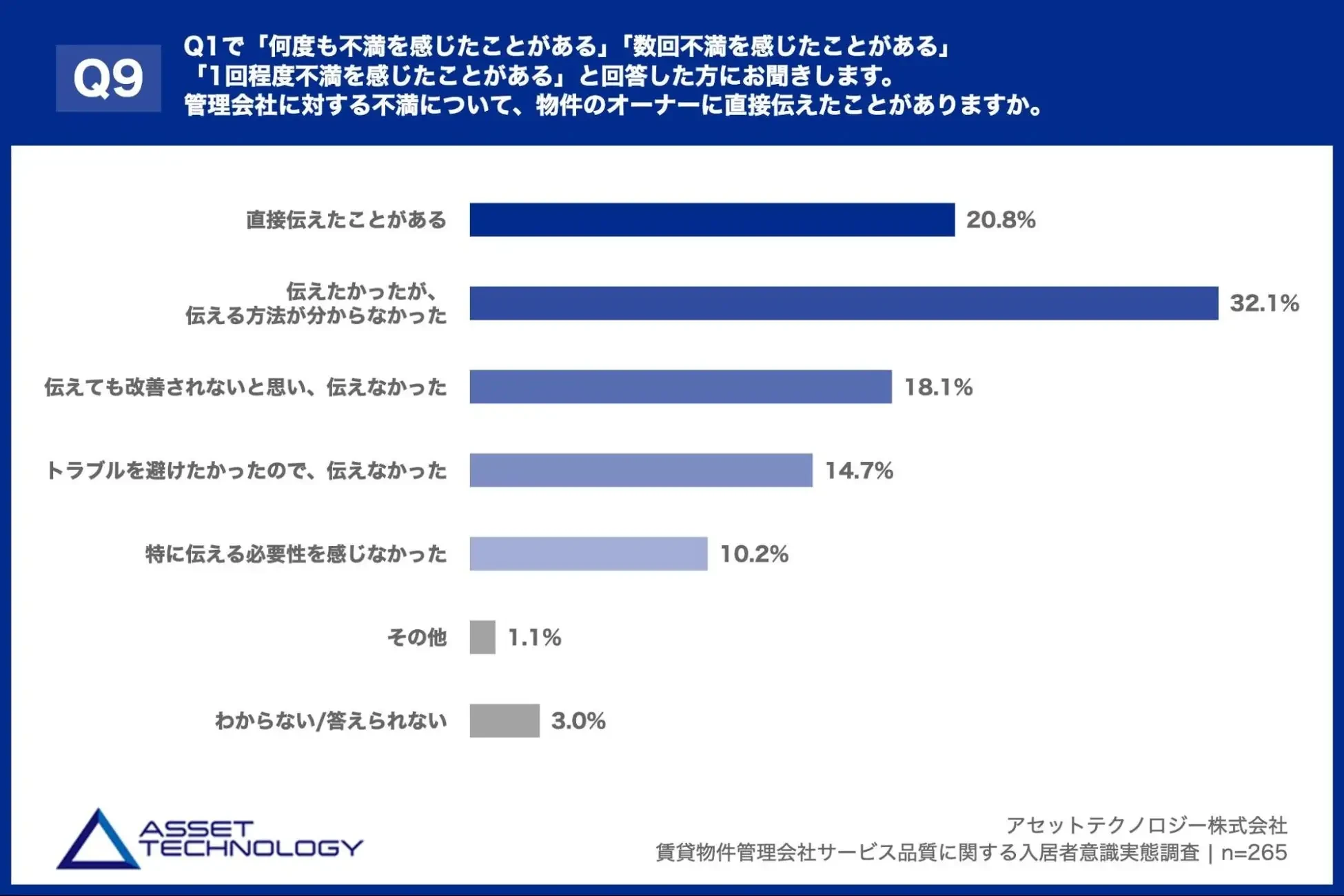 「Q9. Q1で「何度も不満を感じたことがある」「数回不満を感じたことがある」「1回程度不満を感じたことがある」と回答した方にお聞きします。管理会社に対する不満について、物件のオーナーに直接伝えたことがありますか。」(n=265)と質問したところ、「直接伝えたことがある」が20.8%、「伝えたかったが、伝える方法が分からなかった」が32.1%という回答となりました。