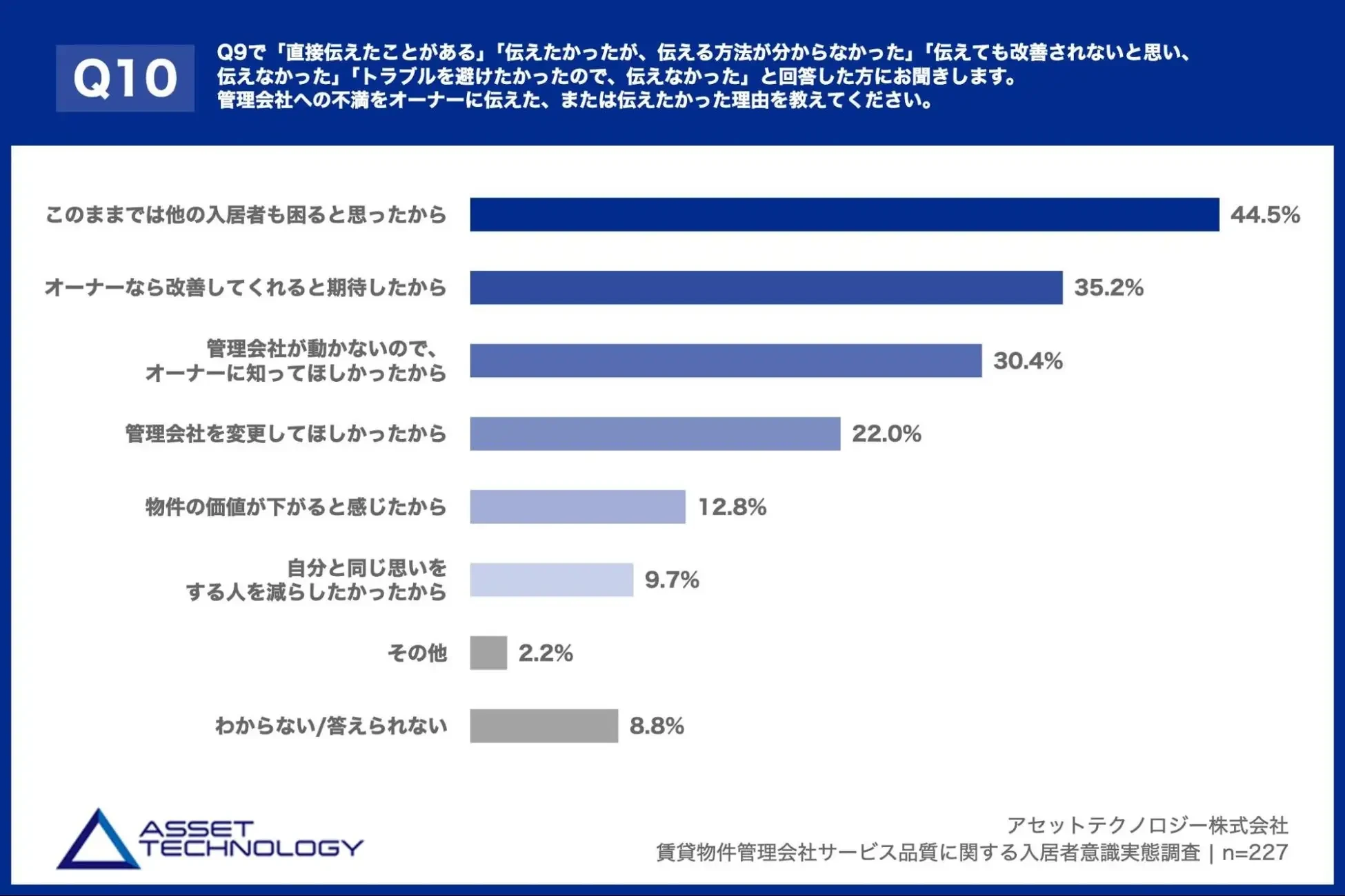 「Q10. Q9で「直接伝えたことがある」「伝えたかったが、伝える方法が分からなかった」「伝えても改善されないと思い、伝えなかった」「トラブルを避けたかったので、伝えなかった」と回答した方にお聞きします。管理会社への不満をオーナーに伝えた、または伝えたかった理由を教えてください。(複数回答)」(n=227)と質問したところ、「このままでは他の入居者も困ると思ったから」が44.5%、「オーナーなら改善してくれると期待したから」が35.2%、「管理会社が動かないので、オーナーに知ってほしかったから」が30.4%という回答となりました。