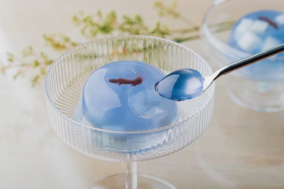高島市から望むびわ湖は、透き通る淡水の青色が美しく、その澄むような景色に誰もが心奪われます。ゼリーの美しいブルーの秘密は、滋賀県産の天然ハーブの“バタフライピー”。