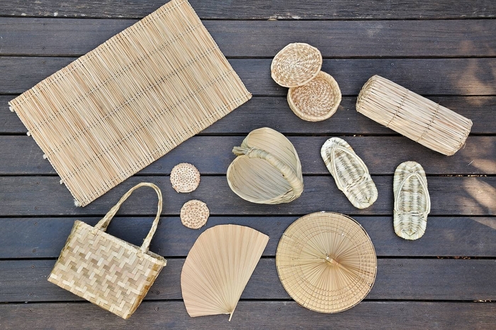 かつて竹富島では、暮らしに必要な道具のほとんどが各家庭で作られていました。民具作りのことを島では「手業」と呼びます。農具から子どもの遊び道具まで、自生する様々な植物の特性を生かして作られ、手業は発展していきました。作るものによっては同じ植物でも採取に適した時期が異なるとされます。とくに秋は植物の色が白く、質が良いとされる材料が収穫しやすい時期であると島では言われています。豊かな自然を生かして暮らしてきた先人の知恵に触れ、島ならではの手業を体験してほしいと思い本プログラムを開発しました。