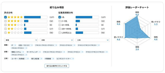 本機能は、DX・ITツールの導入を検討するユーザーが、実際の利用者による評価や使用感に基づいて製品を比較・判断できるよう支援することを目的としています。ベンダー提供情報だけでは伝わりにくい使用感や満足度を補完し、より納得感のある選定を後押しします。