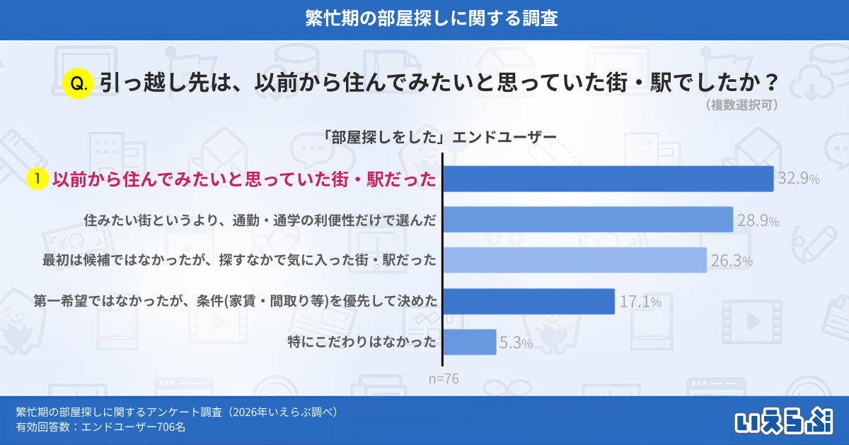 「部屋探しをした」と回答したエンドユーザーに、「引っ越し先は、以前から住んでみたいと思っていた街・駅でしたか?」と質問したところ、「以前から住んでみたいと思っていた街・駅だった」が32.9%で最多となりました。