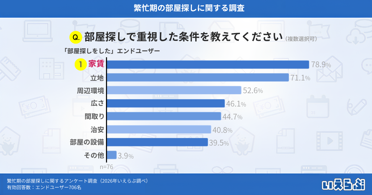 これらの結果から、繁忙期の部屋探しでは物件不足や募集開始後の早期成約などを背景に、多くの人が早めに行動し、限られた選択肢のなかで家賃や立地などの条件を比較しながら慎重に部屋探しを進めていることがわかります。