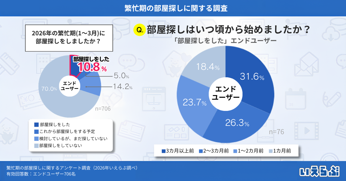 不動産業界特化のDX支援サービスを展開する、株式会社いえらぶGROUP(本社:東京都新宿区、代表取締役:岩名泰介、以下「いえらぶGROUP」)は、エンドユーザーに対して「繁忙期の部屋探しに関するアンケート調査」を実施しました。有効回答706件の調査結果を発表します。