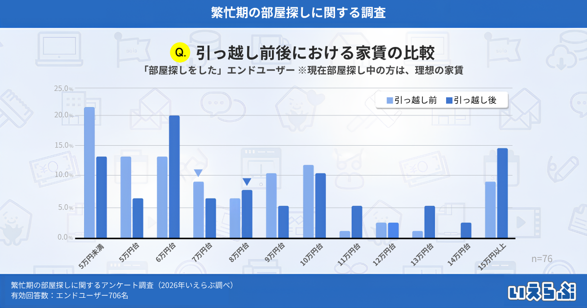 - 引っ越し前後の家賃中央値は約1.2万円アップ、理想と現実のギャップも