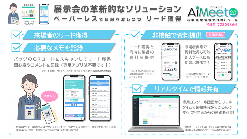 AiMeet(R)2.0サービスは、これからの展示会において革新的なDX体験を約束します。AiMeet(R)2.0サービスは、クラウドベースのWeb管理ソフトウェア「AiManager」とスマホスキャナー「ViScanner」の組み合わせによって、展示会のペーパーレス化を実現し、出展社と来場者の双方に優れたユーザーエクスペリエンスを提供します。