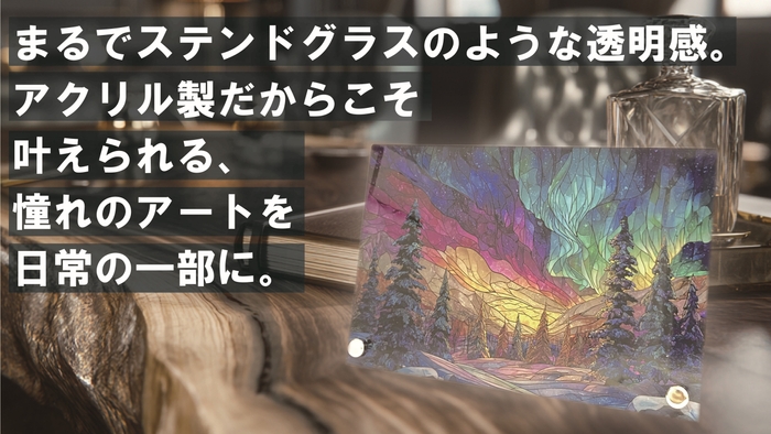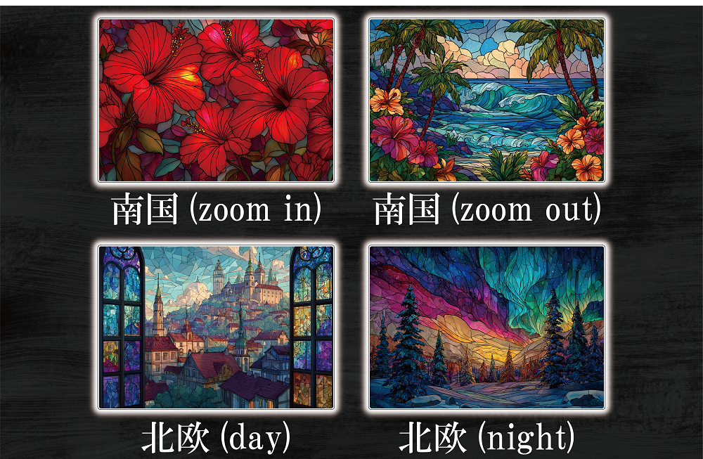 まるで本物のステンドグラスを思わせるデザイン、日本を象徴する景色や四季を表現したデザインなど全20種類を展開。AIデザインとアクリル加工技術により、ステンドグラスのような表現を、軽量かつ手に取りやすい価格で実現しています。