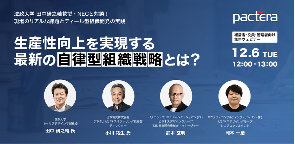 本セミナーでは、経営やマネジメント層は、社員の持続的な成長と自律意欲を高め続けるためには何をすべきか?また、社員の意識や行動を変える仕組み、その変化を可視化するために何を実践すべきか?というテーマを「法政大学キャリアデザイン学部 田中 研之輔教授」と「日本電気株式会社 DBPUビジネスオファリング統括部 ディレクター 小川 祐生氏」をお招きし、明日から実践できる組織のエンゲージメントを高める知見を余すことなくお伝えいたします!