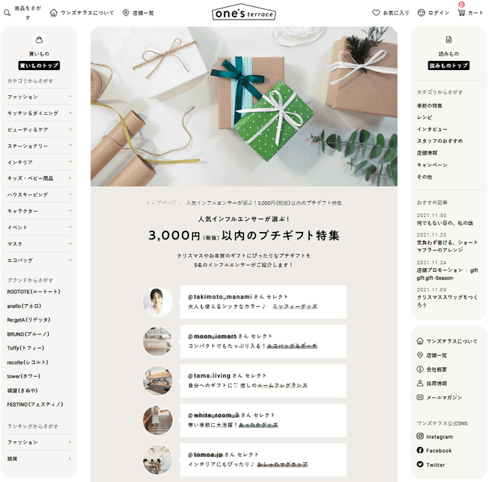 株式会社ライフスタイルイノベーションが運営する「one’sterrace」は、ホリデーシーズンに向けて、ライフスタイル提案で人気のインフルエンサーがおすすめする “3,000円(税抜)以下のプチギフト特集”を公開しました。