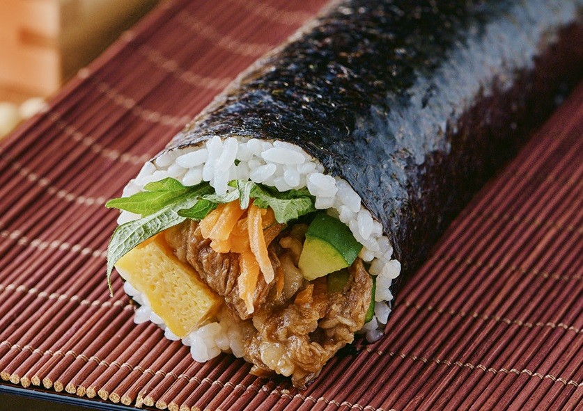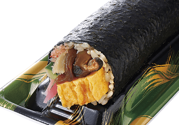 十勝牛しぐれ煮・玉子・にんじん・大葉・きゅうりが入った太巻。通常品と比較して食品添加物をさらに減らしています。