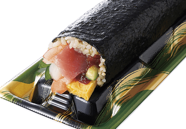 いか・まぐろ・サーモン・海老・きゅうり・玉子・大葉が入った海鮮太巻。