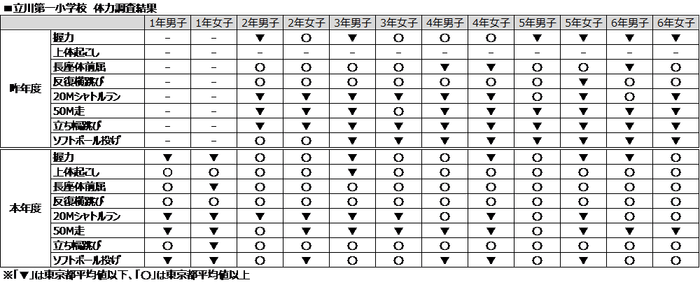 各学年男女別で競技ごとに東京都平均値と測定結果を比較し、東京都平均値以上の競技種目が約30%増加しました。「長座体前屈」「反復横跳び」「立ち幅跳び」に関しては全学年で東京都平均値以上の測定結果となりました。