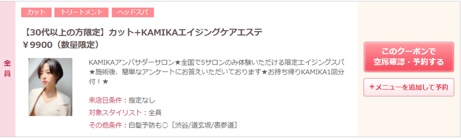 現在のKAMIKAアンバサダーサロンは下記都内5サロン。HotPepperBeautyからの予約限定でお申込みが可能となっております。